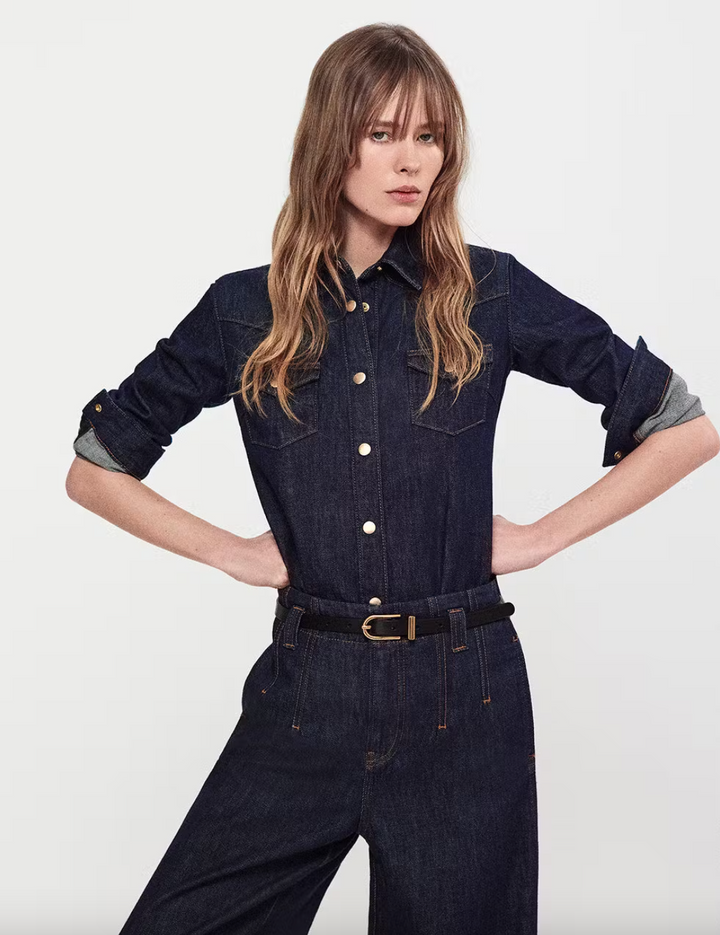 This heritage denim shirt is a wardrobe hero piece. Featuring western-inspired detailing, front chest pockets and silver snap closure, we love this with everything from matching denim to leather bottoms.