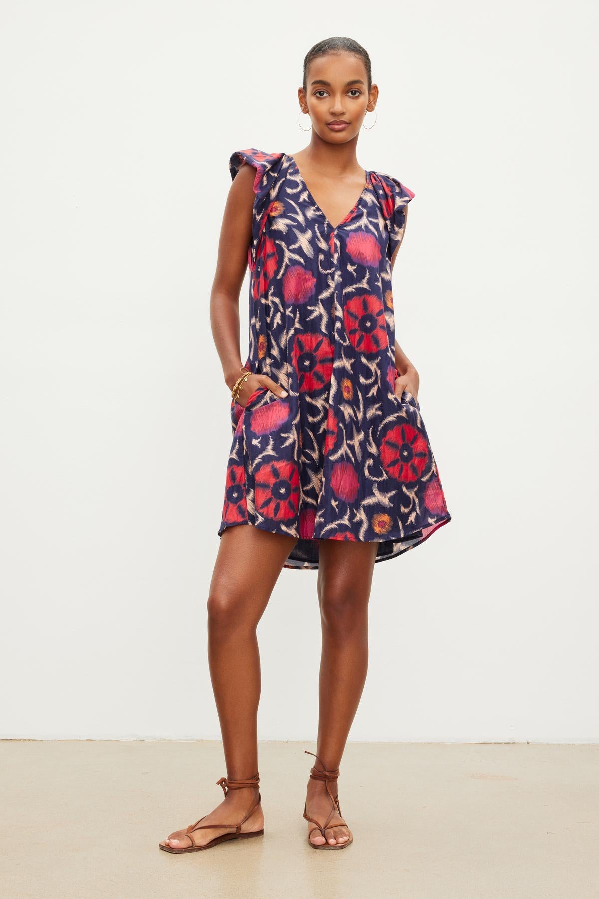 Crafted from luxurious silk cotton voile, the Jenna dress features a stunning abstract print, a flattering A-line silhouette, V-neckline and delicate flutter sleeves. Designed with convenience in mind, this dress also includes pockets.