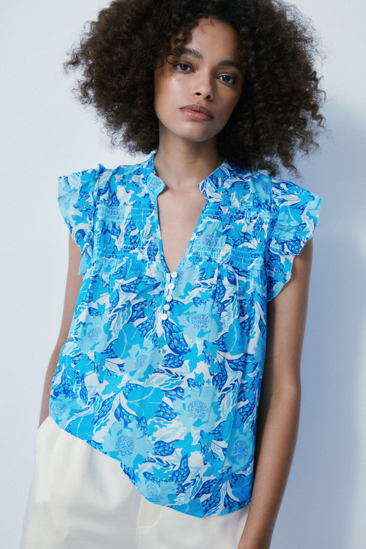 This frilly printed blouse features a V-neckline and smocking at the chest.