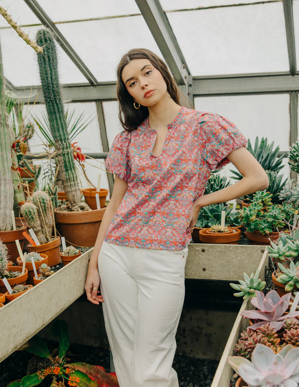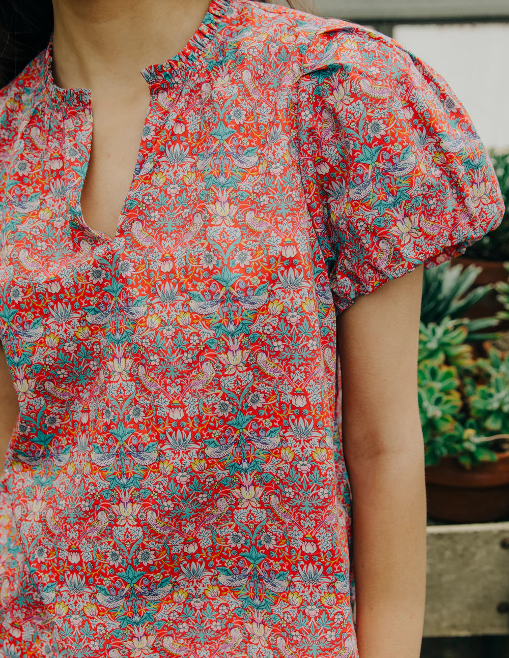 The Lia Top blends easy charm with timeless detail. Featuring a relaxed silhouette, subtle gathers at the shoulder, and a split neckline easy for everyday wear.