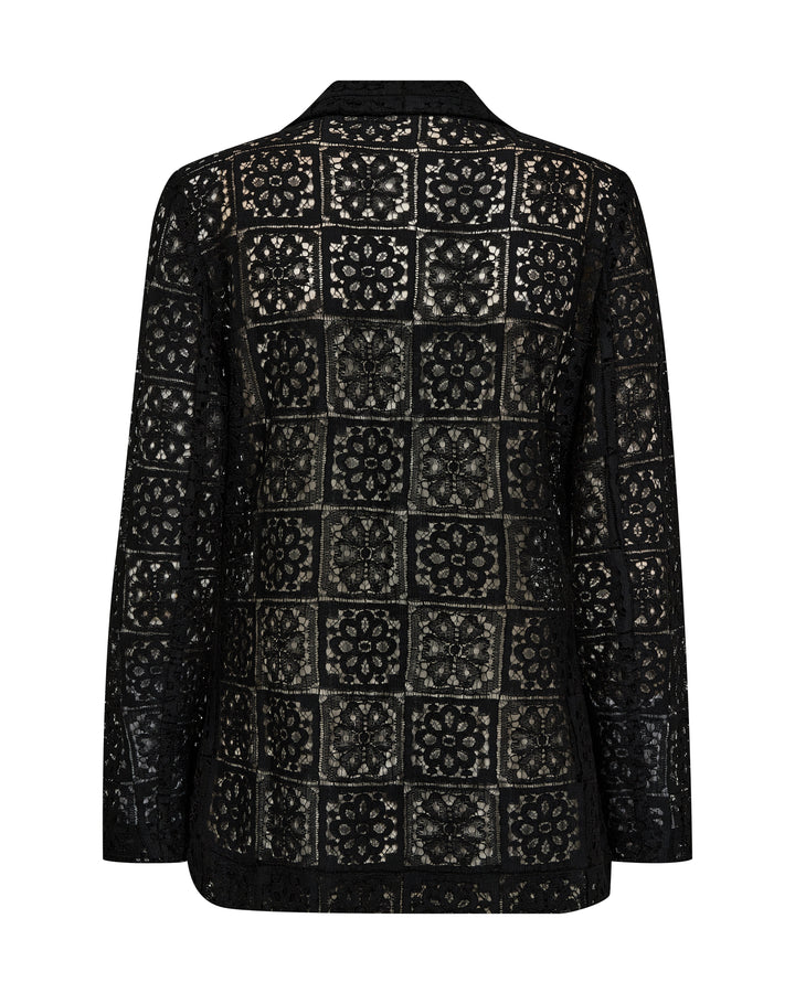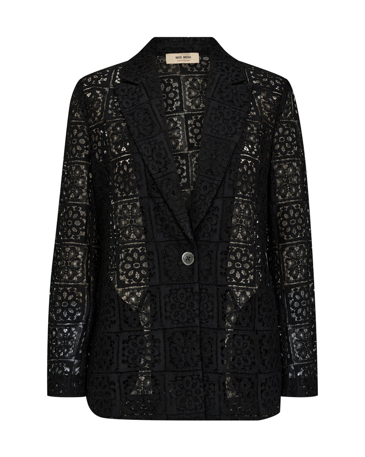Redefine tailoring with this exquisite blazer, a masterpiece of elegance and modernity. Designed in a classic regular fit, it features an ethereal, see-through unlined lace construction that adds a delicate yet bold twist to traditional suiting. A single shimmering mother-of-pearl button at the front lends a touch of refined luxury, while the wide lapels and functional pockets enhance its sophisticated design. Pair it effortlessly with the matching lace pants for a striking coordinated look, or layer it over a flowing, feminine dress to create a captivating ensemble for a summer party.