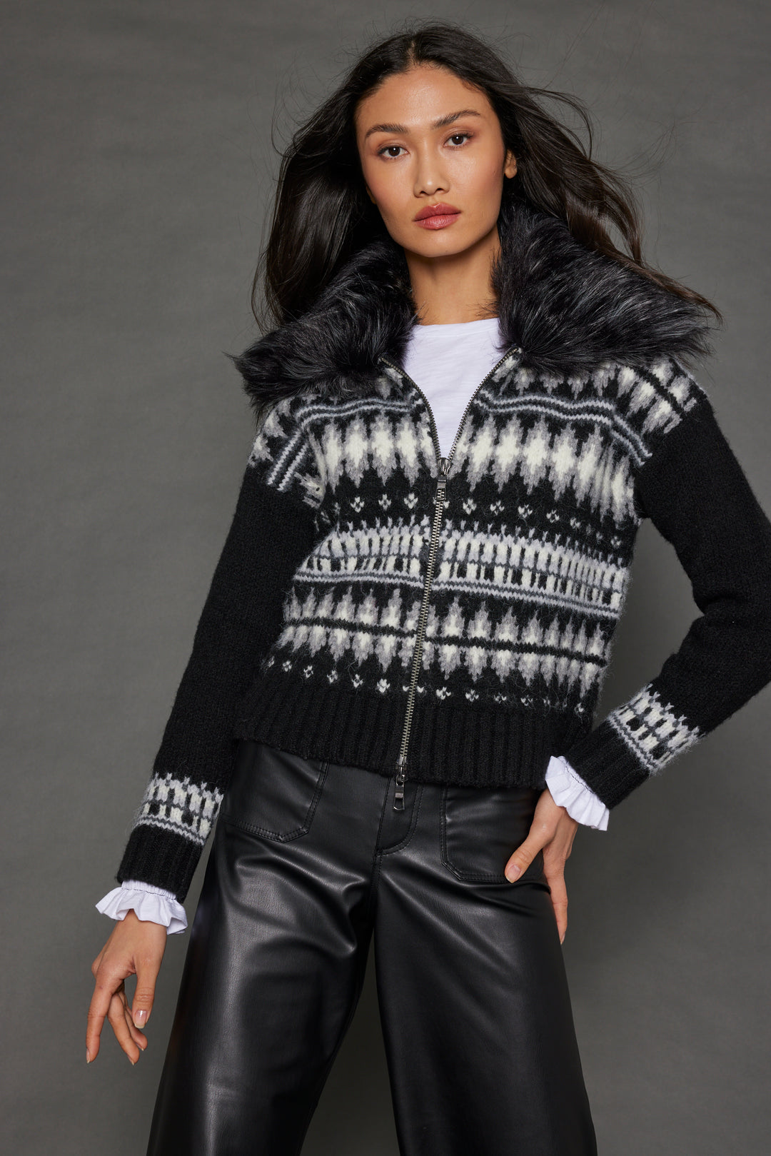 Turn heads in the new Powder Puff zip-up sweater! Featuring a Fair Isle pattern and a sweet faux fur collar - this will be a must-have for your apres ski adventures.