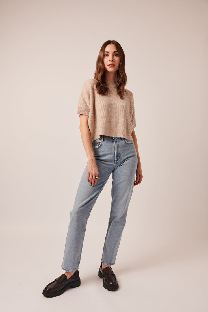 The Reyna Knit is a versatile must-have for any wardrobe. With a relaxed fit and slightly cropped design, this short sleeve sweater offers both comfort and style.