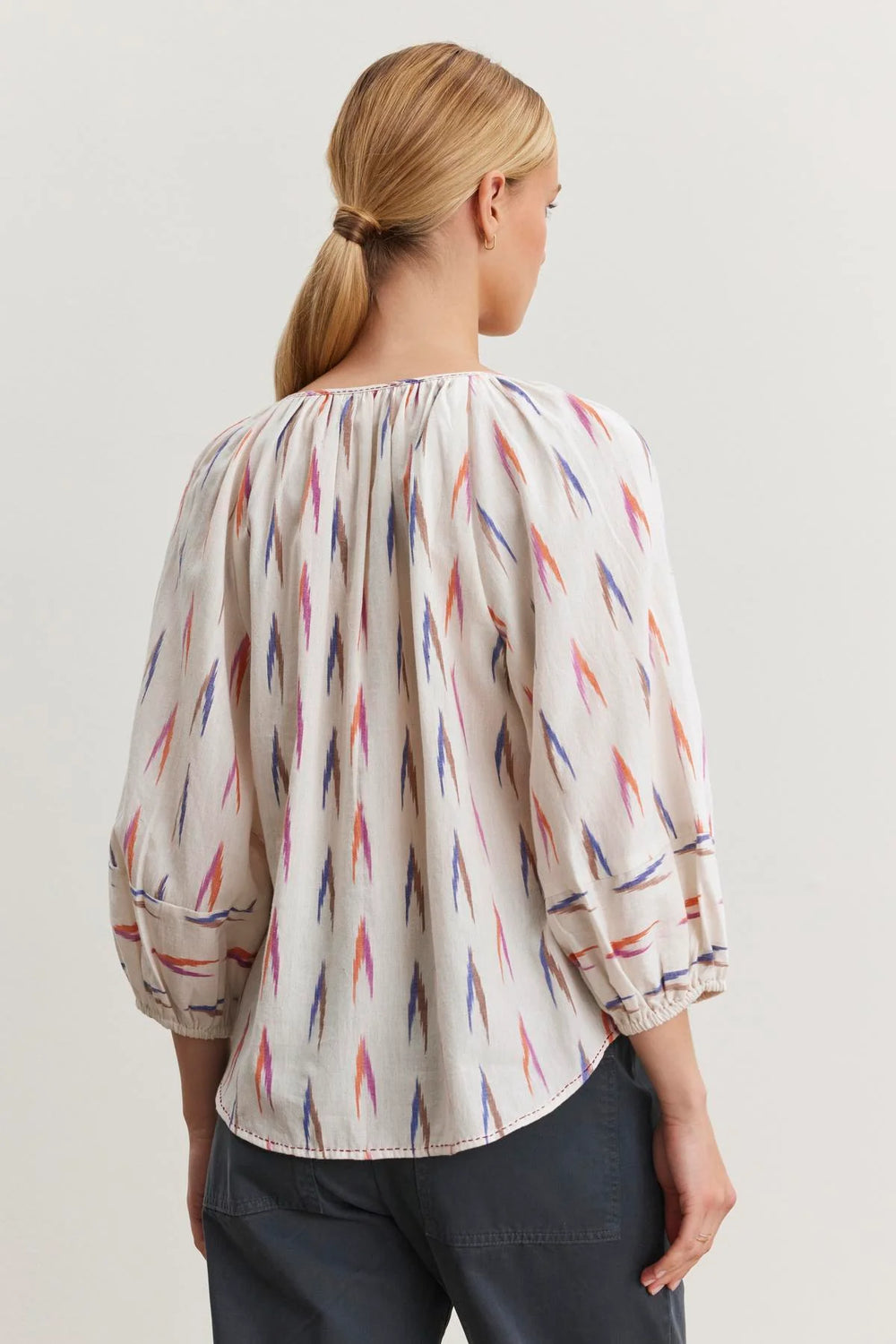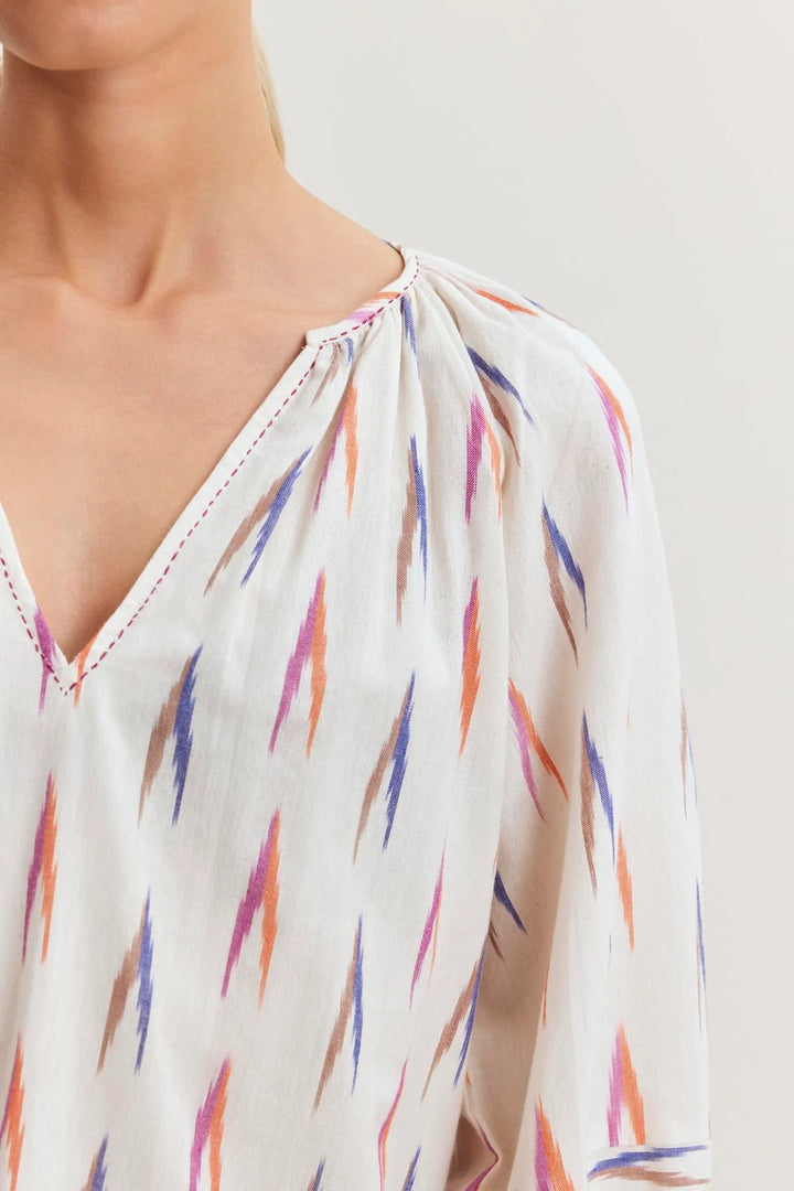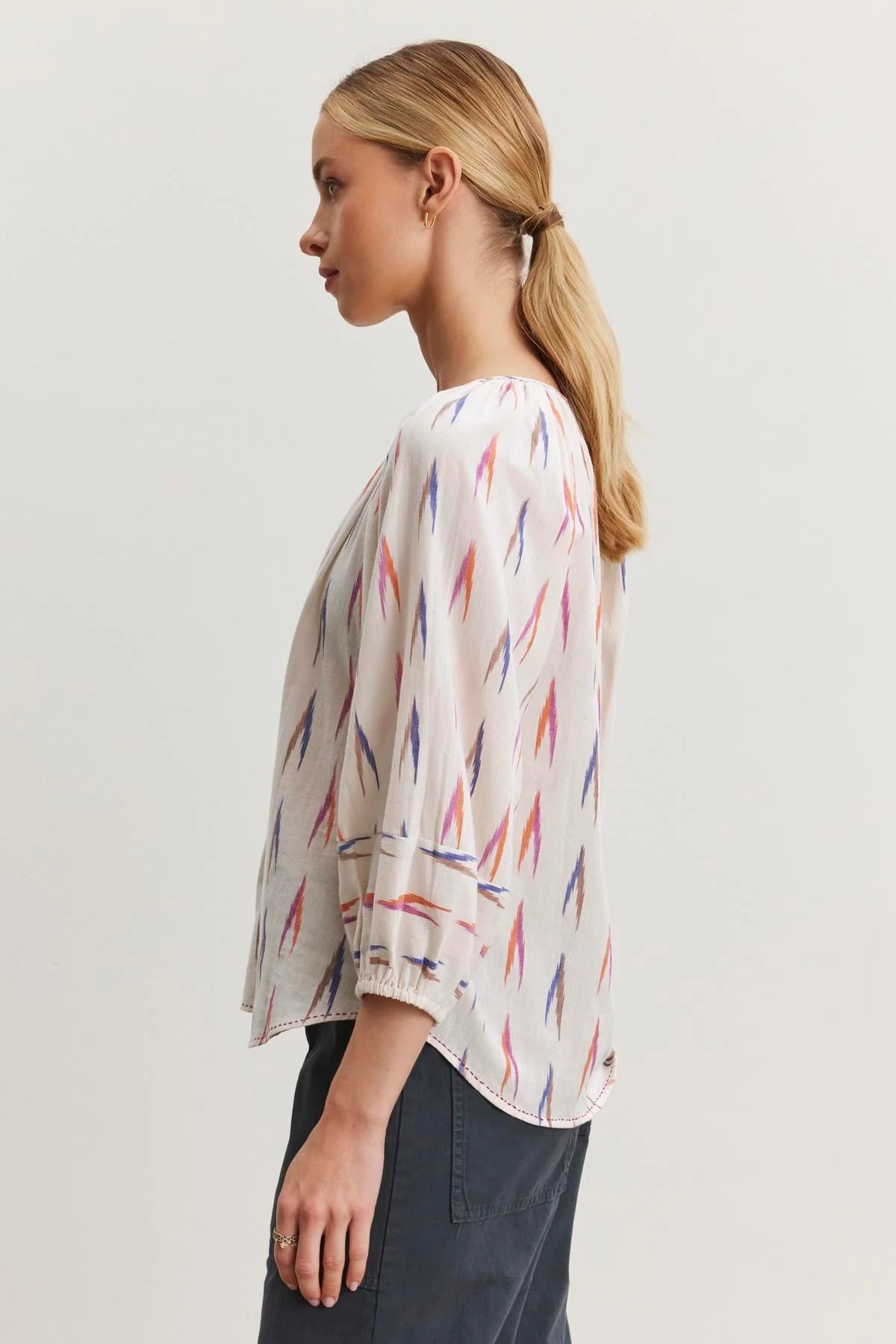This top features a v-neckline and elastic cuffs, along with 3/4 sleeves for a comfortable fit. Made from lightweight cotton with an ikat weave, it has a scooped hemline that adds a relaxed vibe.